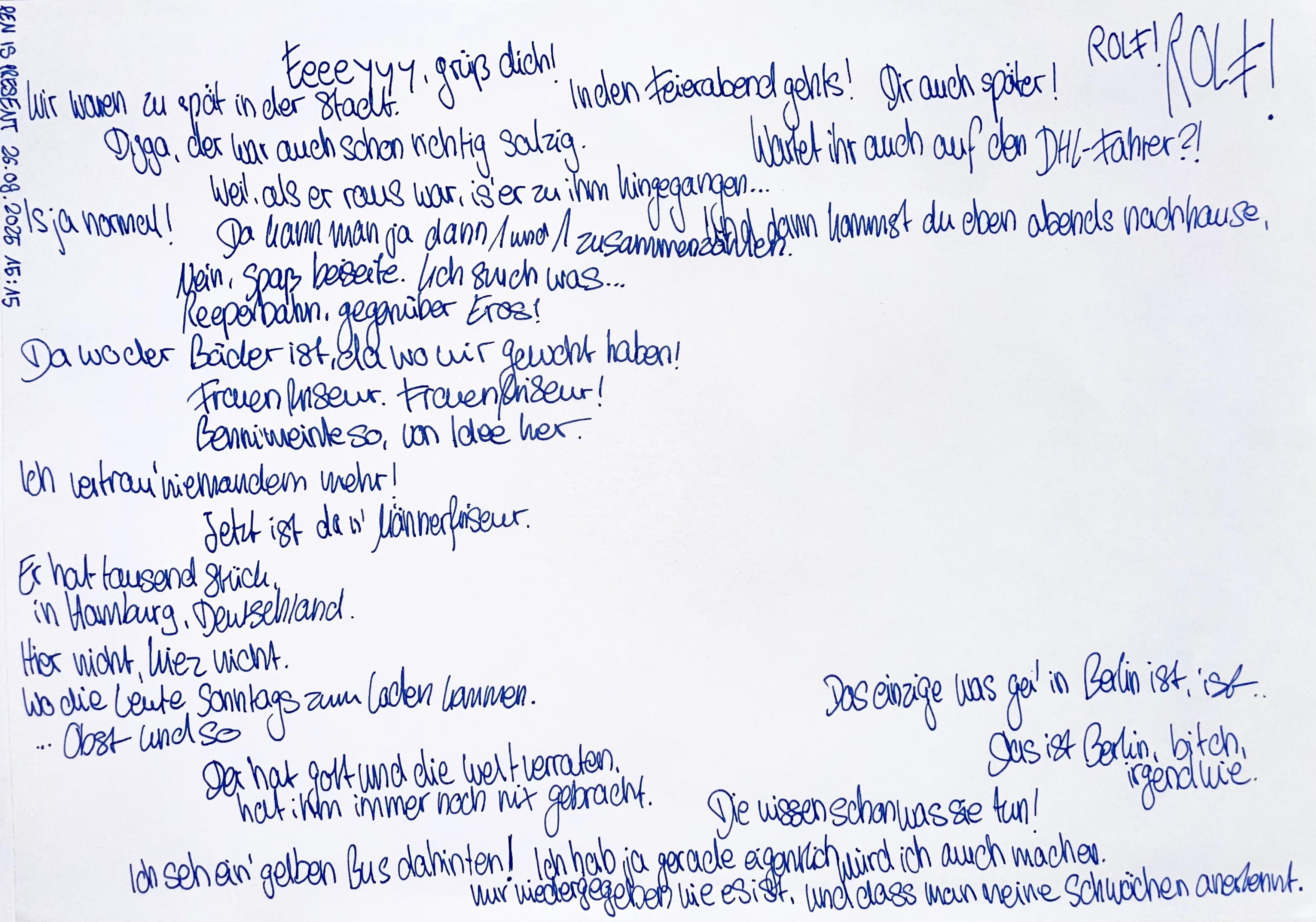 Dieses Werk formte sich durch Zuhören. Blaue Tinte auf weißem Papier, voll nach durchschnittlich 20 Minuten. Viel mehr ist nicht passiert, als dass Gehörtes direkt aufgeschrieben wurde. Dabei folgen die Wörter der Dynamik in der sie vorbeiliefen und das Blatt füllt sich Zeile für Zeile. Chronologisch vertikal und nicht bedacht auf Vollkommenheit. The Artist is Present, aber viel unauffälliger. Der Stift ist da, Präsens wird festgehalten. Dabei entscheidet die Stadt was bleibt, indem sie den Haupt- vom Nebensatz ausradiert, mit ihren anderen Melodien von links und rechts und gegenüber.