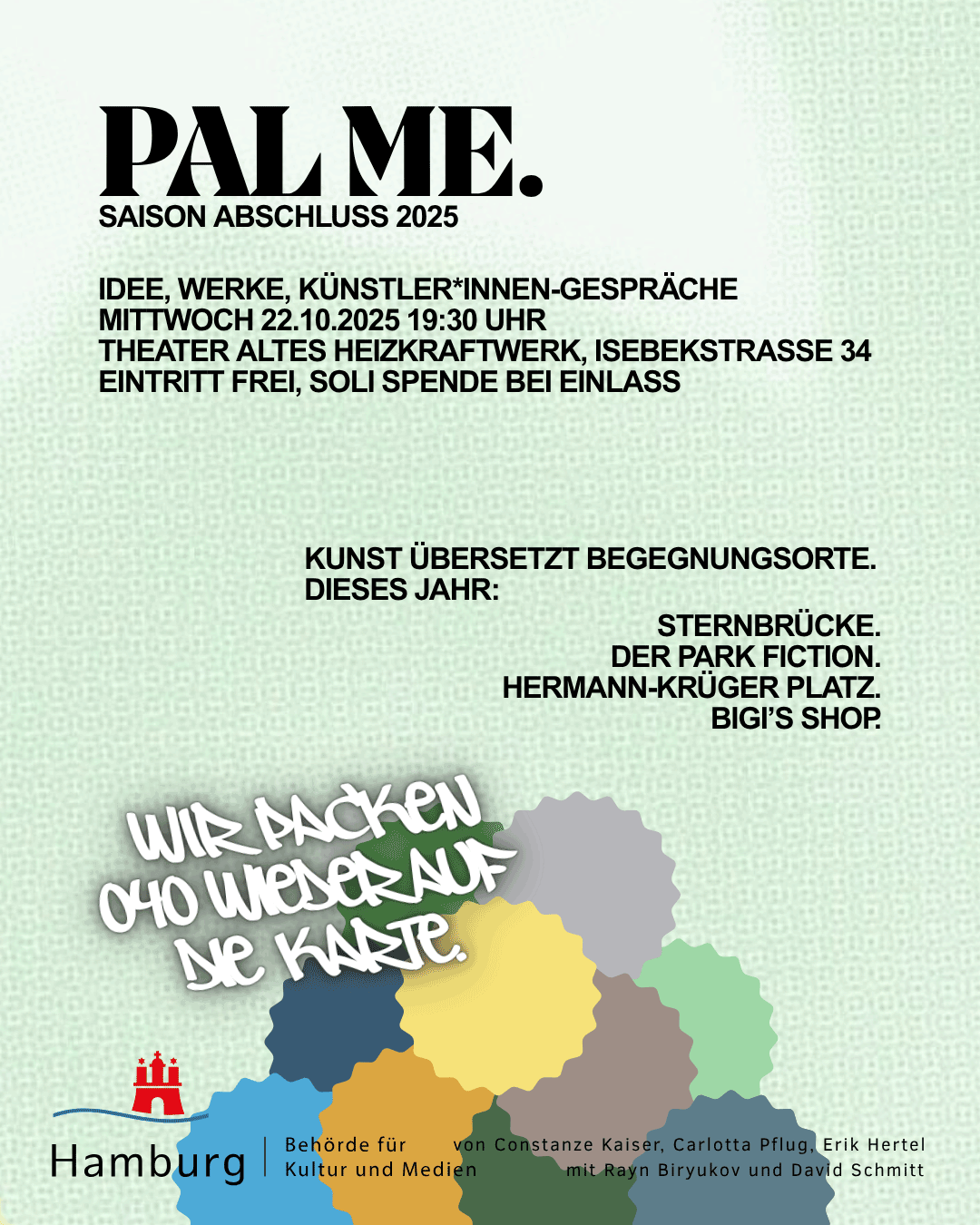 Nennt es Vernissage, nennt es Premiere, nennt es Lecture Performance, nennt es das Happening der Happenings, das Ende, der Anfang, der Abend an dem alles sich trifft. Wir haben dieses Zusammenkommen erstmal „SAISON ABSCHLUSS“ genannt. Denn nach einem Sommer voller Begegnungen und der Produktionszeit im Atelier, werden Kunstwerke enthüllt. Live und in Farbe fügen sich die verschiedenen Facetten von PAL ME. zusammen, kommen mit Publikum, Interessierten, Stammis, Stimmen der Stadt in Kontakt. Komm doch!